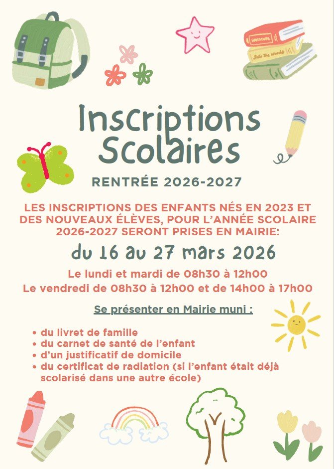 LES INSCRIPTIONS DES ENFANTS NĂS EN 2023 ETÂ DES NOUVEAUX ĂLĂVES, POUR LâANNĂE SCOLAIREÂ 2026-2027 SERONT PRISES EN MAIRIE :