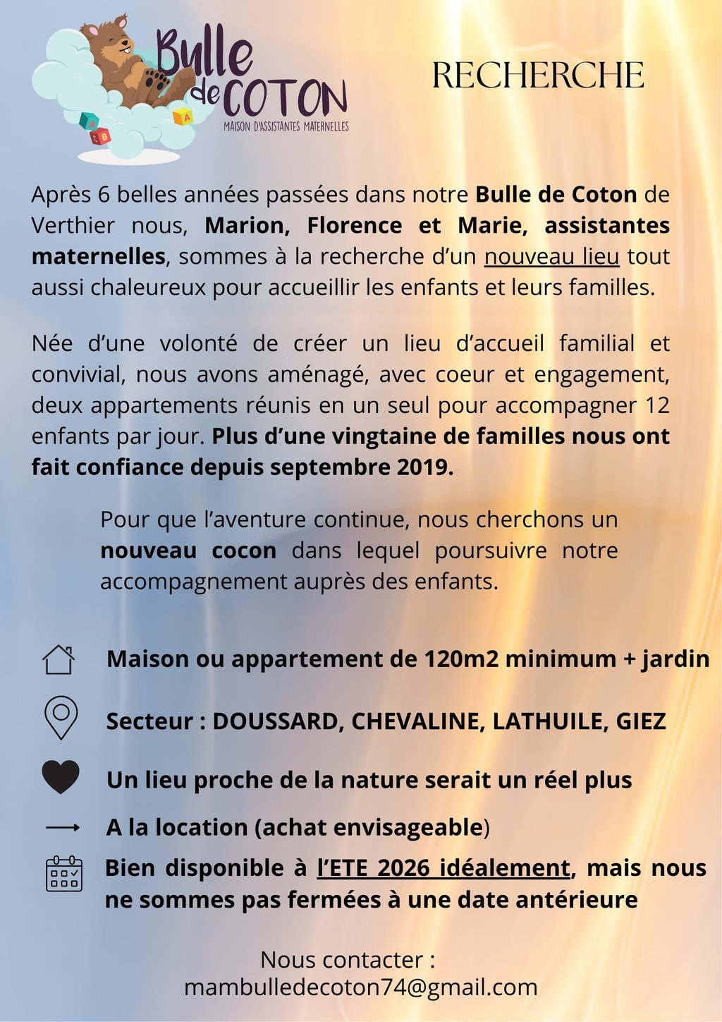 Nous relayons la recherche de maison ou appartement avec jardin (à la vente ou à la location) de la MAM BULLE DE COTON (voir photo) pour l'été 2026, sur les secteurs de DOUSSARD, CHEVALINE, LATHUILE, GIEZ