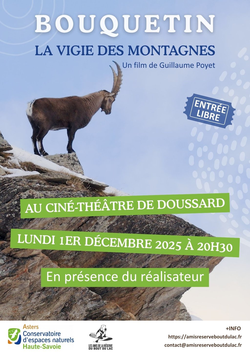 Projection du film "Bouquetin, la vigie des montagnes" le lundi 1er décembre à 20h30 au ciné-théâtre de Doussard en présence du réalisateur Guillaume Poyet (Prix Spécial Tallinn Zoo (Matsalu Nature Film Festival 2025, Estonie).
