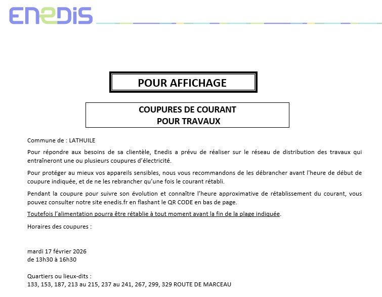 Horaires des coupures : mardi 17 février 2026 de 13h30 à 16h30