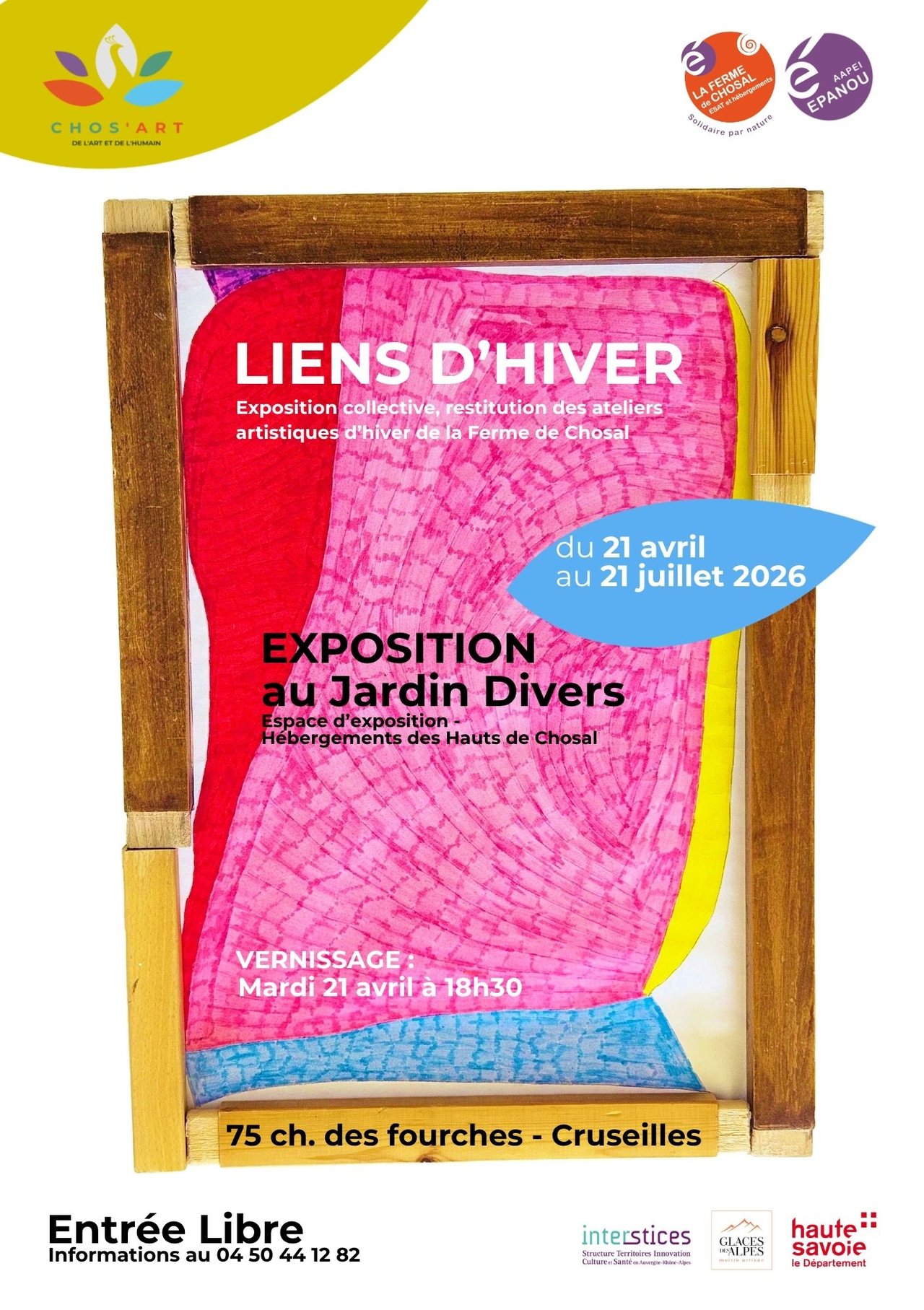 Cette exposition collective « Liens d’hiver » est le résultat du travail de recherche, d’expérimentations et de créations, effectué entre les mois de novembre et mars par les participant.e.s. dans les différents ateliers proposés et encadrés par des artistes dans des pratiques pluridisciplinaires.